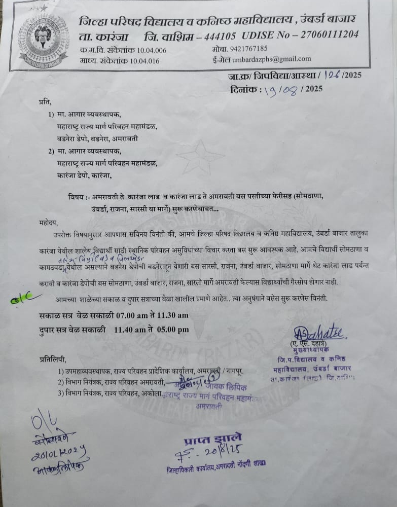 इससे परिवहन मंडळ के खाते मे भी फायदा हो सकता और काफी संख्या मे प्रवासी होने के कारण परिवहन महामंडल को इसका आर्थिक लाभ भी होगा बडनेरा डेपो से अमरावती से कारंजा मार्क सारशी राजना उंबरेला सोमठाणा मार्क्स से सुबह आठ बजे और दुपहर एक बजे ऐसी बस फेरी शुरू करने के लिए कारंजा तक शुरू करने के लिए परिवहन मंडळ को द्यापन दिया और उस निवेदन में अमरावती डिव्हिजन मे भेजने का लिखा है और कारंजा डेपो की गाडी सोमठाणा उंबरठा राजीना सारशी मार्ग से अमरावती सुबह साडे छे बजे और दुपहर एक बजे ऐसे टाइमिंग के लिये वहा पर भी निवेदन दिया गया लेकिन अभी तक इस निवेदन का कोई जवाब नही आया जिल्हा परिषद विद्यालय कनिष्ठ विद्यालय उंबरडा बाजार के मुख्याध्यापक के एस धात्रे , सरपंच राज नरहरी चौधरी उपसरपंच रघुनाथ भगत सचिव जयकिशन आडे वाढोण रामनाथ के सरपंच सौ वनिता विष्णुपंत तिरमारे उपसरपंच स्वप्निल मधुकर कडू इन सभी सामाजिक कार्यकर्ताओ ने तथा नांदगाव खंडेश्वर के वाईंडर साक्ष के रहने वाले विलास भाऊ बोबडे और सभी ग्रामवासीओ ने निवेदन दिया.