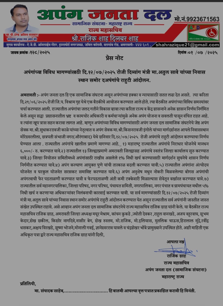 जि.प. विश्राम गृह येथे एक बैठकीचे आयोजन करण्यात आले होते. त्या बैठकीत अपंगांच्या विविध समस्यांवर चर्चा करण्यात आली. राज्यातील अपंगांचा जलद गतीने विकास व्हावा त्या करिता. अपंगांच्या विविध मागण्यांसाठी अपंग जनता दल सामाजिक संघटनेचे जेष्ठ अपंग सेवक मा. श्री. सुधाकररावजी काळे यांच्या नेतृत्वात व अपंग सेवक मा. श्री. किसनरावजी इंगोले यांच्या मार्गदर्शनात आपले निवासस्थान मोरेश्वरलीला, छत्रपती संभाजी नगर (औरंगाबाद) येथे शनिवार दि.१२/०७/२०२५ रोजी अपंगांचे राहुटी आंदोलन करण्याचा निर्णय घेण्यात आला. यामध्ये १) महाराष्ट्र राज्यातील अपंगांचे निराधार योजनेचे मानधन ६,०००/- रु. करण्यात यावे. २) राज्यातील १३ जिल्ह्याप्रमाणे अमरावती जिल्ह्यासह अपंगांचे स्वतंत्र जिल्हा कार्यालय सुरु करण्यात यावे.३) जिल्हा नियोजन समितीमध्ये अपंगांसाठी राखीव असलेले १% निधी खर्च करण्यासाठी मार्गदर्शन सुचनेचे शासन निर्णय निर्गमीत करण्यात यावे. ४) अपंग कल्याण आयुक्त पुणे यांची तात्काळ बदली करण्यात यावी. ५) राज्यातील अपंगांना अंत्योदय योजनेत व घरकुल योजनेत सरसकट समाविष्ट करण्यात यावे. ६) अपंग अनुशेष मधुन नोकरी मिळवलेल्या बोगस अपंगांची अपंगत्वाची फेर पडताळणी करण्यात यावी व फेरपडताळणी अंती कमी टक्केवारी मिळाल्यास सेवेतून वर्खास्त करण्यात यावे. ७) राज्यातील सर्व महानगरपालिका, जिल्हा परिषद, नगर परिषद, पंचायत समिती, नगरपालिका, नगर पंचात व ग्रामपंचायत मधील ५% निधी खर्च न करणाऱ्या अधिकाऱ्यांवर निलंबनाची कारवाई करण्यात यावी. या सर्व मागण्यांसाठी दिव्यांग मंत्री मा. अतुल सावे यांच्या निवास स्थान समोर अपंगांचे राहुटी आंदोलन करण्यात येत असून राज्यातील सर्व अपंगांनी जास्तीत जास्त संखेत उपस्थित राहावे. असे आव्हान अपंग जनता दल सामाजिक संघटनेचे राज्य महासचिव राजिक शाह यांनी केले. या बैठकीत राज्य महासचिव राजिक शाह, अमरावती जिल्हा अध्यक्ष मयूर मेश्राम, कांचन कुकडे, ज्योती देवकर, राहुल वानखडे, अजय बहूरवाघ, शुभम केदार, शेख शकील, किशोर नागदिवे, नासीर बेग, शेख रुस्तम, मो. राजिक, मो. इलियास, मुतलिक चाऊस, हिरालाल मुंद्रे, स्वींद्र धसकट, अक्षय विरखडे, शुष्मा भोजने, मोनाली गवई, ज्ञानेश्वरराव यावले व चंद्रशेखर भोंबे प्रामुख्याने उपस्थित होते. अशी माहिती एक अधिकृत पत्रा द्वारे राज्य महासचिव राजिक शाह यांनी दिली.