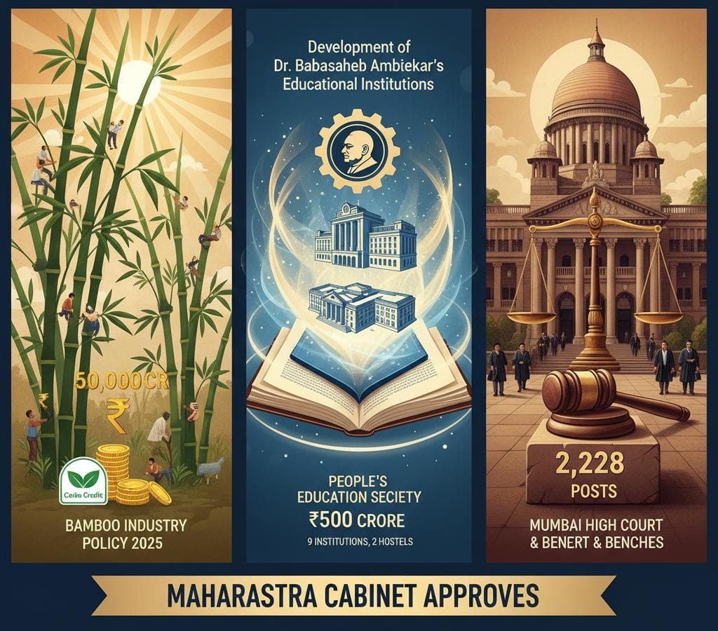 महाराष्ट्र मंत्रिमंडळाच्या मंगळवारी झालेल्या बैठकीत औद्योगिक विकास, सामाजिक न्याय आणि न्यायिक पायाभूत सुविधा या क्षेत्रांमध्ये अनेक महत्त्वाचे निर्णय घेण्यात आले. या निर्णयांमुळे राज्यातील रोजगार निर्मिती, शैक्षणिक उन्नती आणि न्यायव्यवस्थेची कार्यक्षमता वाढण्यास हातभार लागणार आहे.