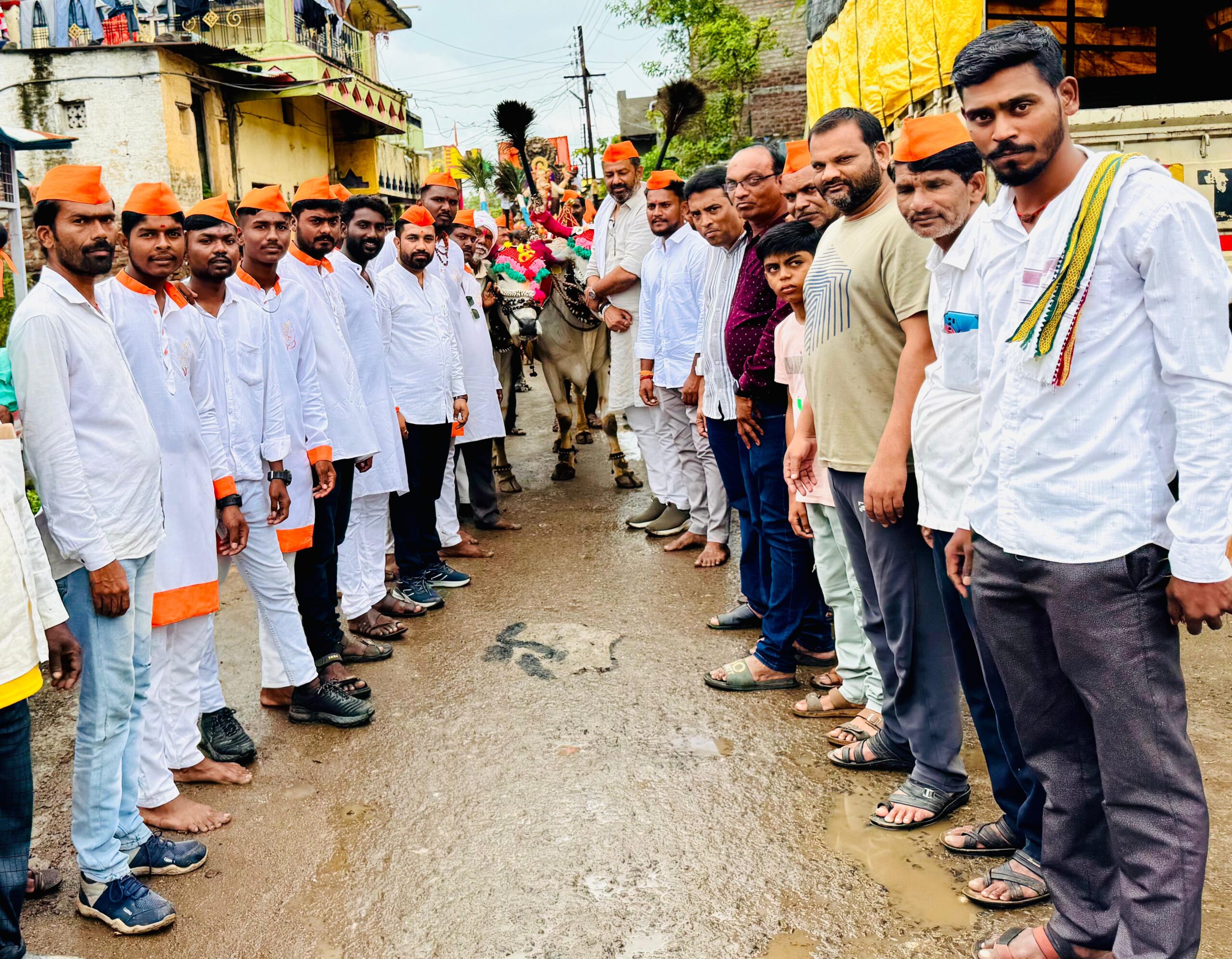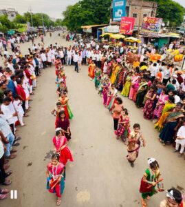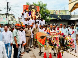 उत्सव म्हटला की ढोल ताशा सजावट जल्लोषाने केला जातो मात्र राधे गणेशोत्सव मंडळाने दरवर्षीप्रमाणे या वर्षी सुद्धा आगळावेगळा गणेशोत्सव साजरा केला दहा दिवसीय विविध सामाजिक, धार्मिक, सांस्कृतिक कार्यक्रमाचे आयोजन केले होते गणपती विसर्जन मिरवणुकीत पारंपारिक पद्धतीने भारतीय संस्कृतीचे जतन करून डीजे, ढोल ताशे याला फाटा देत गुलाल न उधळता मिरवणुकीवर फुलांचा वर्षाव करून वारकरी दिंड्या लहान मुलींचे लेझीम पथक विशेष आकर्षण होते अकरा बैल जोड्याचा रथ ज्यात गणेशाची मूर्ती विराजमान होती महिलांची दिंडी छत्रपती शिवाजी महाराज डॉ बाबासाहेब आंबेडकर,अण्णाभाऊ साठे महात्मा ज्योतिबा फुले तुकडोजी महाराज गाडगेबाबा, लोकमान्य टिळक,स्वामी विवेकानंद, शहीद विकास उईके यांच्या प्रतिमा सुद्धा देखाव्यात होत्या तसेच मंडळाच्या कार्यकर्त्यांनी घातलेला विशिष्ट पोशाख उपस्थितांना आकर्षित करीत होता यावेळी महिलांची लक्षणीय उपस्थिती होती अतिशय शांतता प्रिय वातावरणात गणपती विसर्जन मिरवणूक पार पडली ठाणेदार श्रीराम लांबाडे यांनी पोलिसांचा चोख बंदोबस्त ठेवला. सामाजिक कार्यकर्ते प्रकाश मारोटकर यांनी नियोजनबद्ध मिरवणुकीचे आयोजन केले होते.