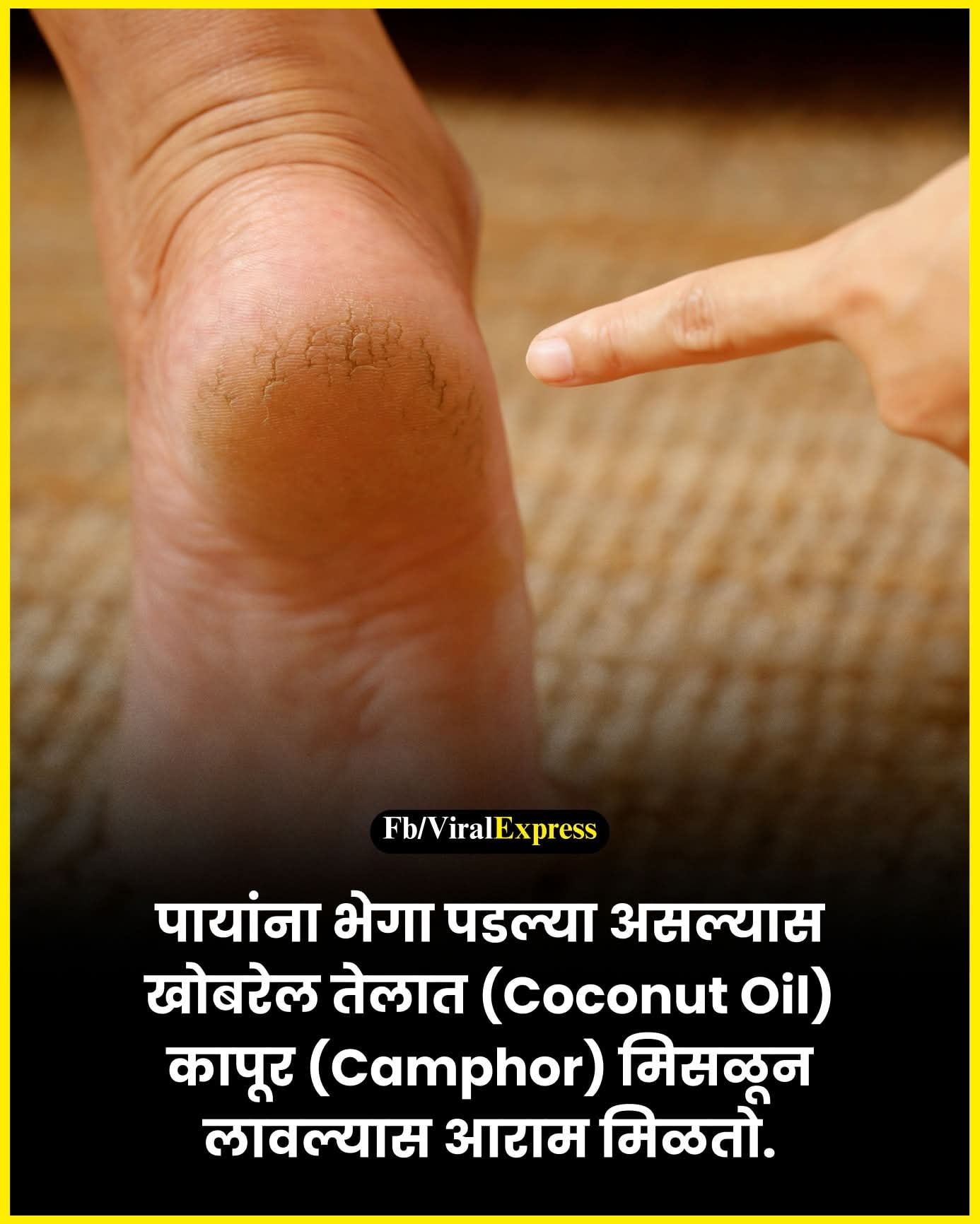 पायांना भेगा पडणे (Cracked Heels) ही कोरड्या त्वचेमुळे होणारी एक समस्या आहे. खोबरेल तेल (Coconut Oil) हे उत्तम मॉइश्चरायझर आहे आणि कापूर (Camphor) मध्ये दाहक-विरोधी (Anti-inflammatory) गुणधर्म असतात.