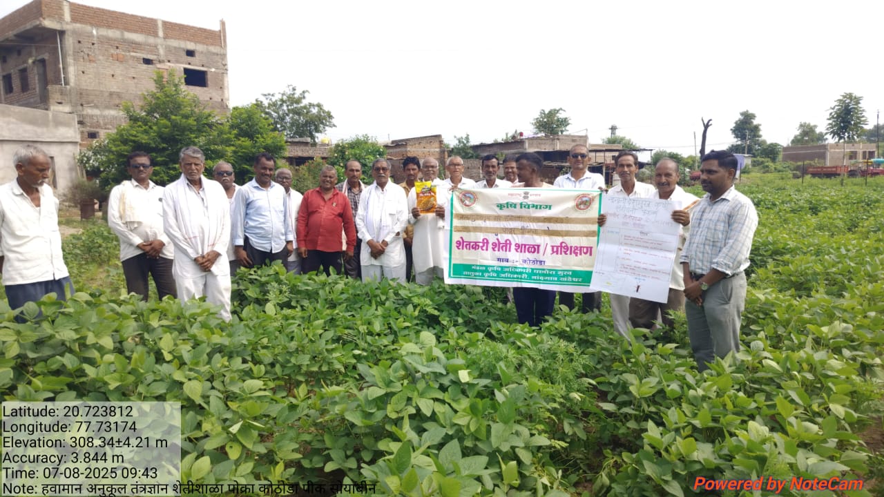 नांदगाव खंडेश्वर तालुक्यातील कोठाडा या गावांमध्ये उपविभागीय कृषी अधिकारी अमरावती श्री चेडे यांच्या मार्गदर्शनाखाली श्री अनिल पांडुरंगजी इंगोले यांच्या शेतात नानाजी देशमुख कृषी संजीवनी प्रकल्प अंतर्गत सोयाबीन पिकाची शेतकरी शेतीशाळा घेण्यात आली. सदर शेती शाळेमध्ये सहाय्यक कृषी अधिकारी पि यू लाडके यांनी सोयाबीन पीक परिसंस्था अभ्यास, सोयाबीन पिकावरील वरील कीड रोग व्यवस्थापन तसेच तन नियंत्रण याबाबत सविस्तर असे मार्गदर्शन करण्यात आले. सदर शेती शाळेमध्ये गावातील मोठ्या प्रमाणावर शेतकरी उपस्थित होते. उपस्थित शेतकऱ्यांपैकी काही शेतकरी यांनी आपले शेतीविषयक मनोगत व्यक्त केले. अशा प्रकारे एकूण सहा सोयाबीन पिकाच्या शेतीशाळा घेण्यात येणार असून हा दुसरा वर्ग संपन्न झाला.