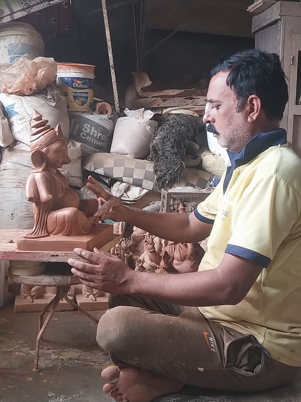 जिससे ग्रामीण इलाकों में मूर्तिकारों के सामने बड़ी दुविधाओं का पहाड़ है बावजूद इसके आज भी ग्रामीण कुंभार समाज अपनी परम्परागत मिट्टी की कलाकृति को संजोये हुये है।उसी में ग्राम के एक युवा मूर्तिकार प्रवीण निले भी अपनी पुश्तैनी मिट्टी की मूर्तियां बनाने का कार्य कर रहे हैं।अब वह आगामी दिनों मे संपन्न होने वाले गणेश उत्सवों व गणेश स्थापना के लिए मूर्ति को आकार देने का काम कर रहे है।पिछले कई वर्षो से ग्रामीण क्षेत्र के यह युवा मूर्तिकार द्वारा अपने पुरखों की इस कला को जीवित रखते हुये आकर्षण मूर्तियों का निर्माण करते आरहे है।पर्यावरण का संतुलन बनाए रखने के लिए प्लास्टर ऑफ पेरिस कि मूर्तियों की जगह मिट्टी की मूर्तियों को अधिक महत्व हैं जिससे उसकि अधिक मांग को ध्यान मे रख आज भी मिट्टी कि मूर्तियों आकार देने का दिया जा रहा है।महँगाई के इस दौर मे मिट्टी की आपूर्ति करना टेडी खीर है तथा 50/60 किलो मीटर दूर जंगलों से काली मिट्टी लाना भी बड़ी कसरत से कम नहीं है जिससे इसको बनाने में सारी बातों से गुजरना पड़ता है।क्षेत्र में मिट्टी कि बनाई मिट्टी की मूर्तियों की अधिक मांग है जिससे भक्तों की मांग के अनुरूप मिट्टी की मुर्तीयो आकार दिया जा रहा है मगर हालात व महँगाई की दिक्कतें आती हैं जिसपर मात करना बड़ी चुनौती कि बात मूर्तिकार निले ने कही।उन्होंने कहा कि 20 किलो ग्राम की मिट्टी की बैग 120 रुपयों जिसे लाने में 50 किलोमीटर का सफर व श्रम तथा खर्च भी इस बिक्री भाव व खर्च के मुताबिक समाधानकारक नहीं होना भी बड़ी समस्या है होने पर उन्हीने नराज़ी व्यक्त की है।इस के बाद भी परंपरागत व्यवसाय,लगन,मेहनत व ज़िद्द के चलते वह इस चुनौती का सामना करते रहे थे।वह इस काम को श्रावण मास से ही शुरू करते है तथा मिट्टी से मूर्तियों को आकार देना शुरू करते है जैसे जैसे मूर्तिया आकार लेती है वैसे वैसे उनकी कलाकृतियों का दर्शन इन मूर्तियो से झलकता है।उनके नुसार आज के इस दौर मे कच्चे माल का जुगाड़ कर अपने कार्य को मूर्त रूप देना भी एक आव्हानात्मक काम है मगर भक्तों की मांग व पर्यावरण की दृष्टि से इस चुनौति को वह स्वीकार कर अपने पारम्परिक इस व्यवसाय को संभाले हुए हैं।कुल मिलाकर अब उनके द्वारा मिट्टी की मूर्तियों का आकार देकर उसे बनाने का काम शुरू किया है तथा गणेश जी के साथ ही अन्य मूर्तियो को भी साकार करने का काम युद्ध स्तर पर शुरू है।